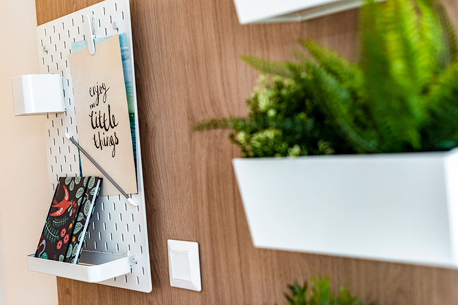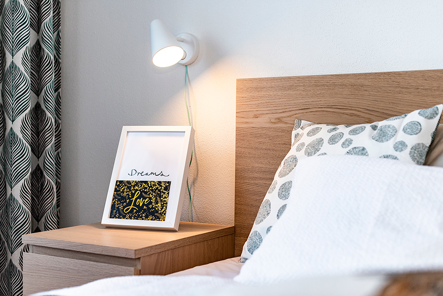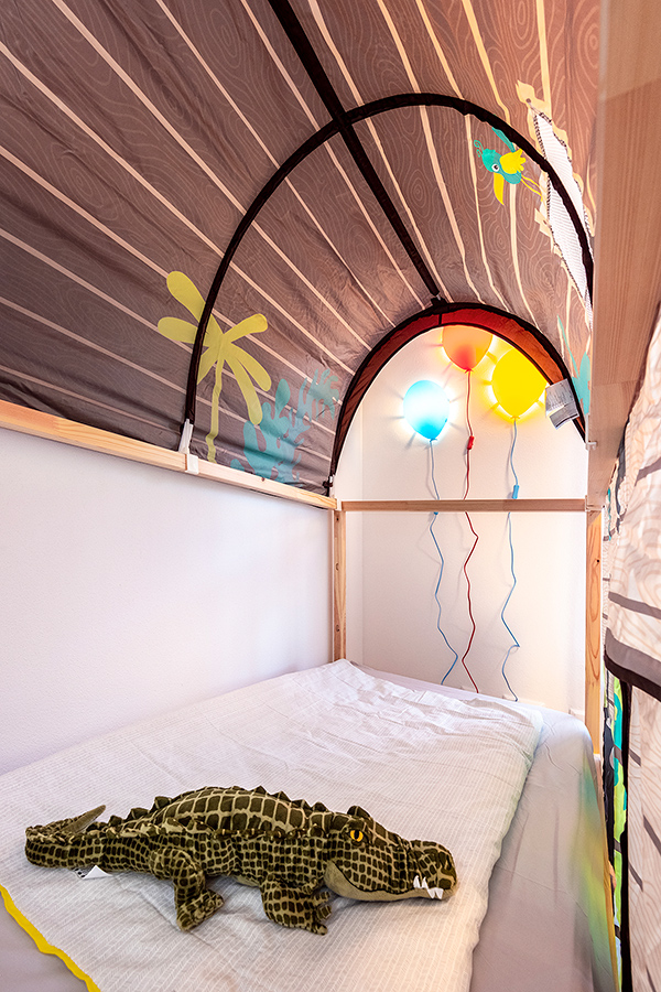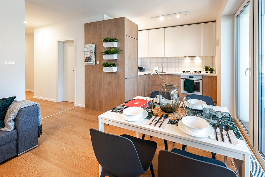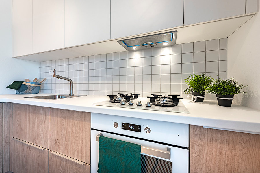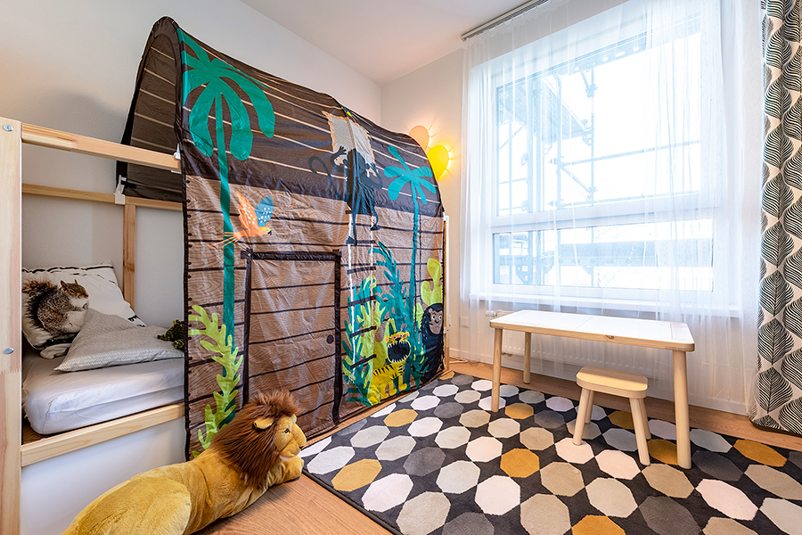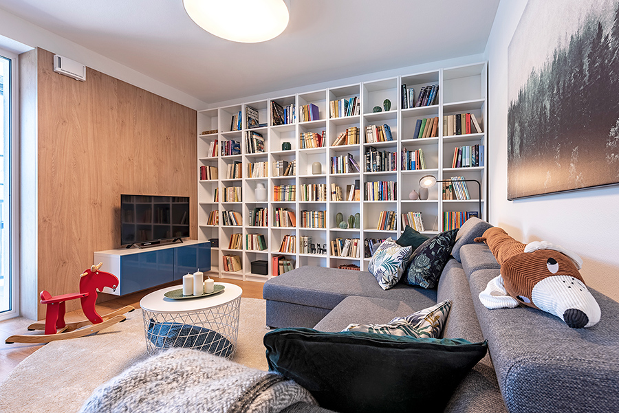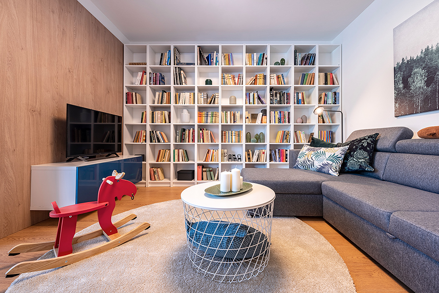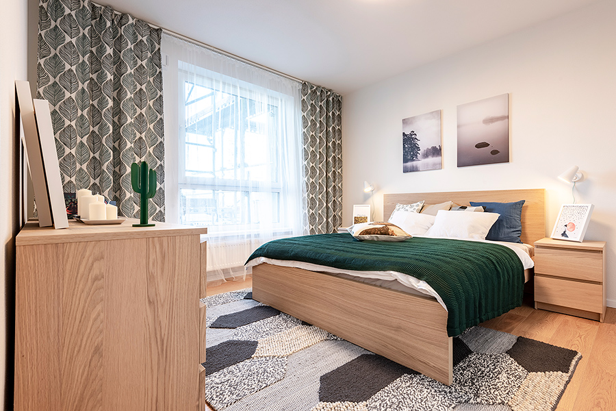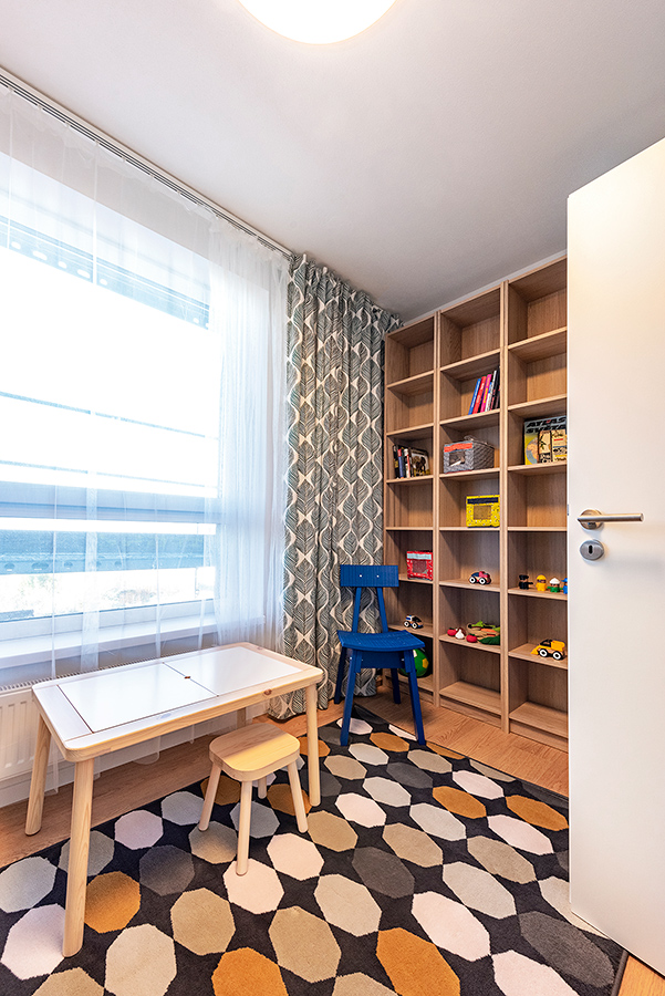 Tammi 5 är en visningslägenhet som vi skapade för det finsk-slovakiska fastighetsbolag YIT. I denna rymliga 3:a som är designad för en ung familj har vi arbetat med mysiga miljöer för att bo och umgås. Det platsbyggda köket, garderoberna och träpanelen i vardagsrummet har vi designat själv. Här finns gott om plats för förvaring. Bokhyllan är däremot från IKEA – en smart och billigare lösning.