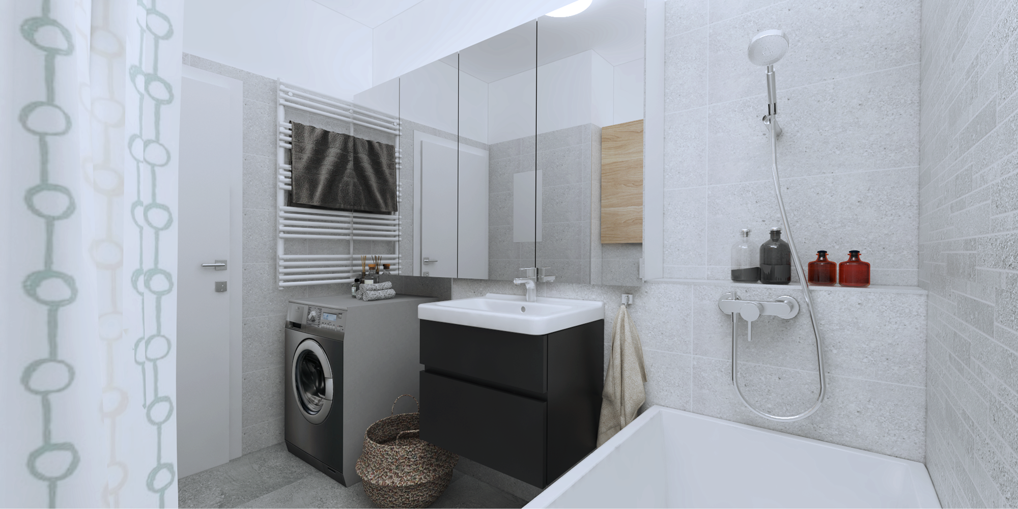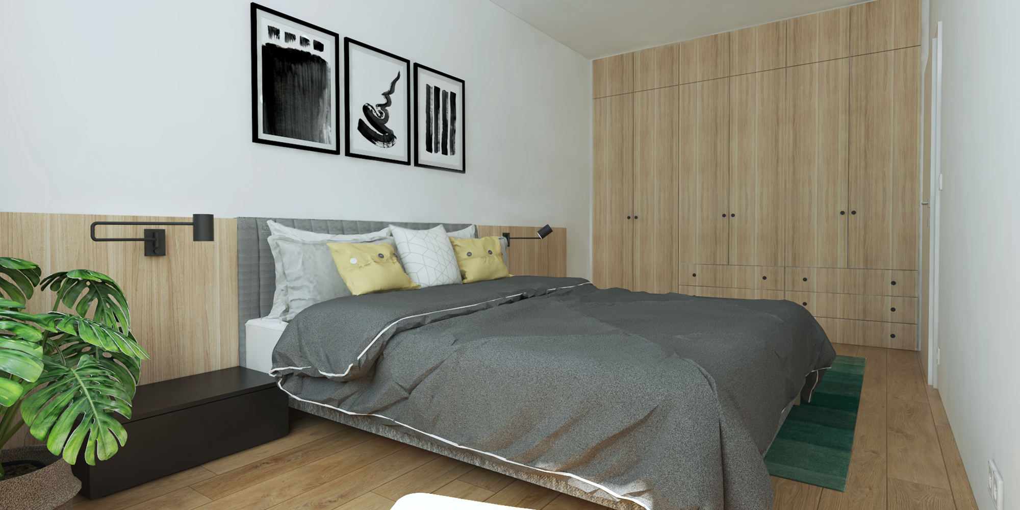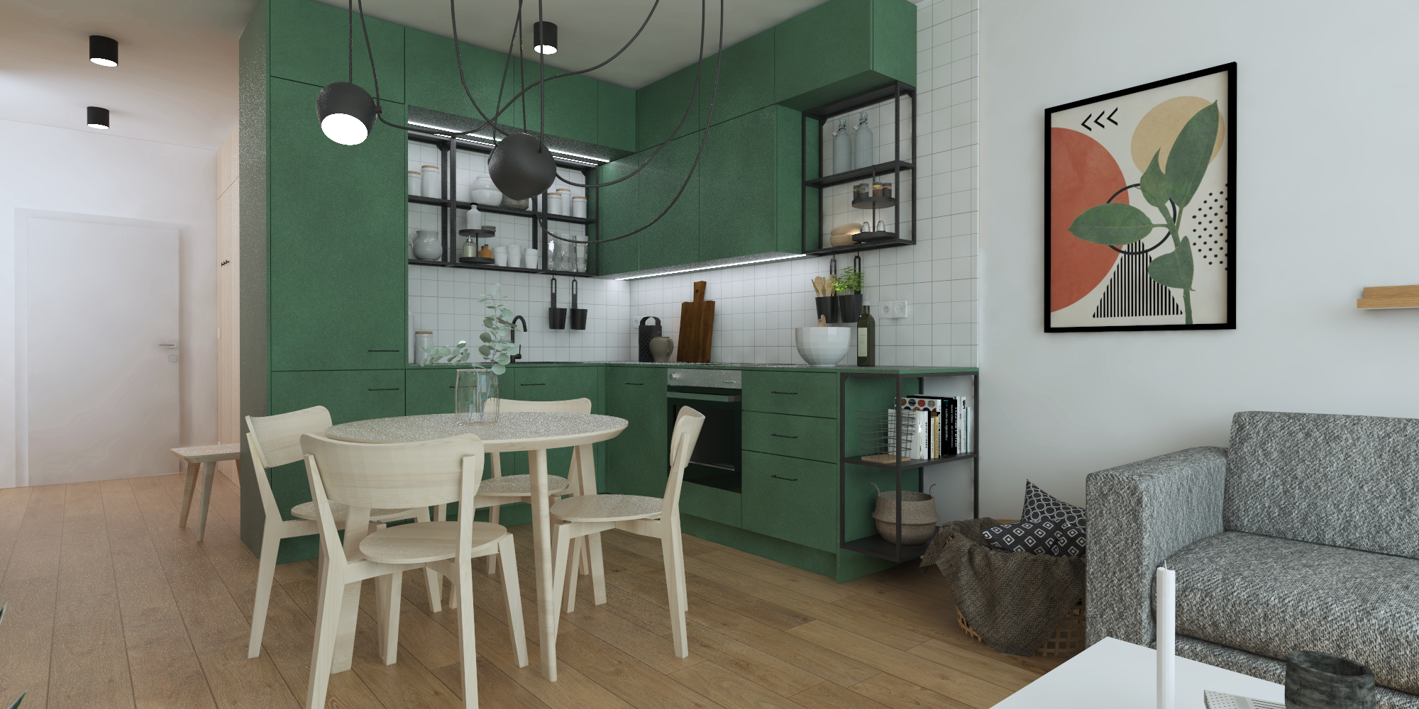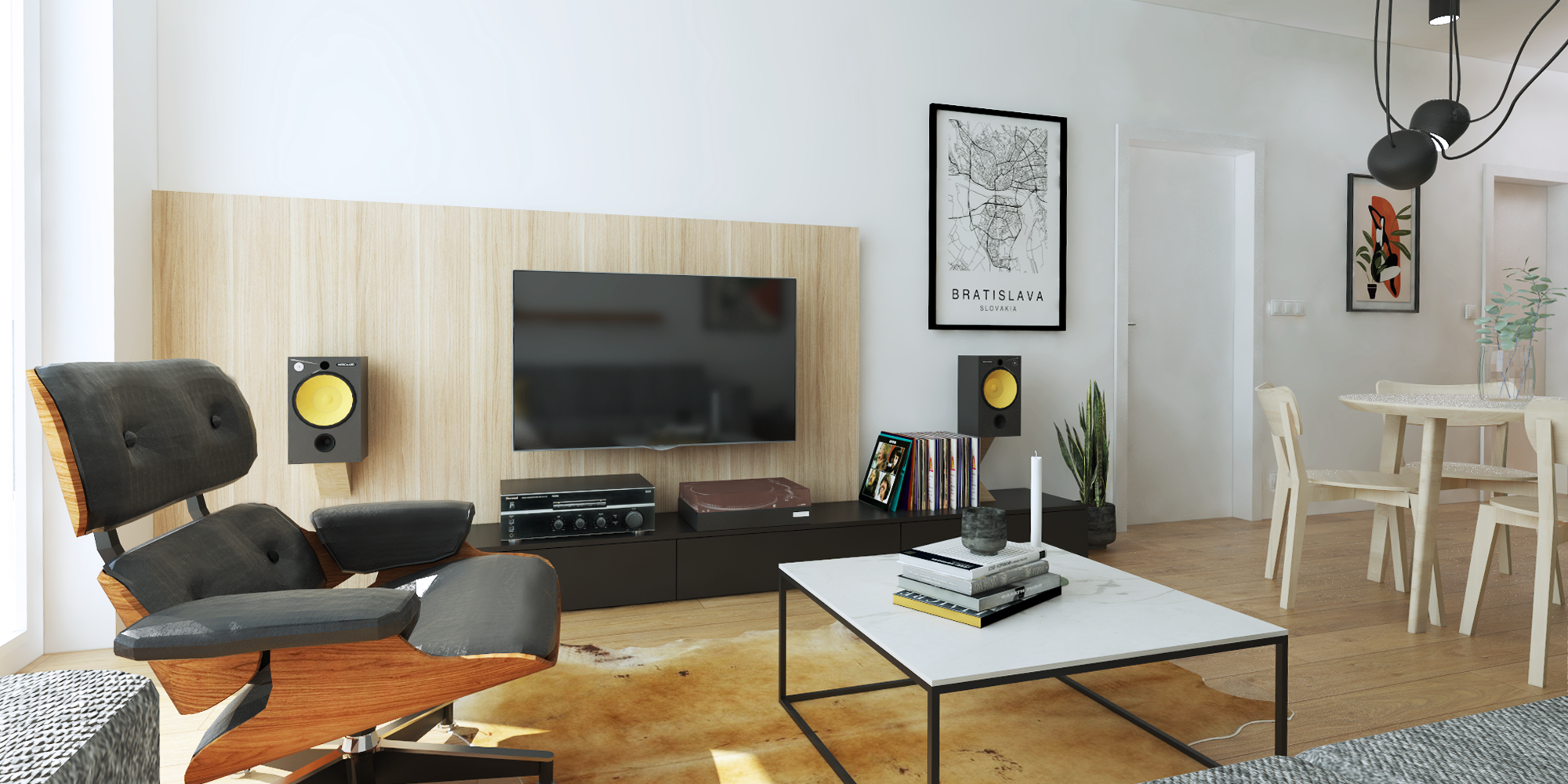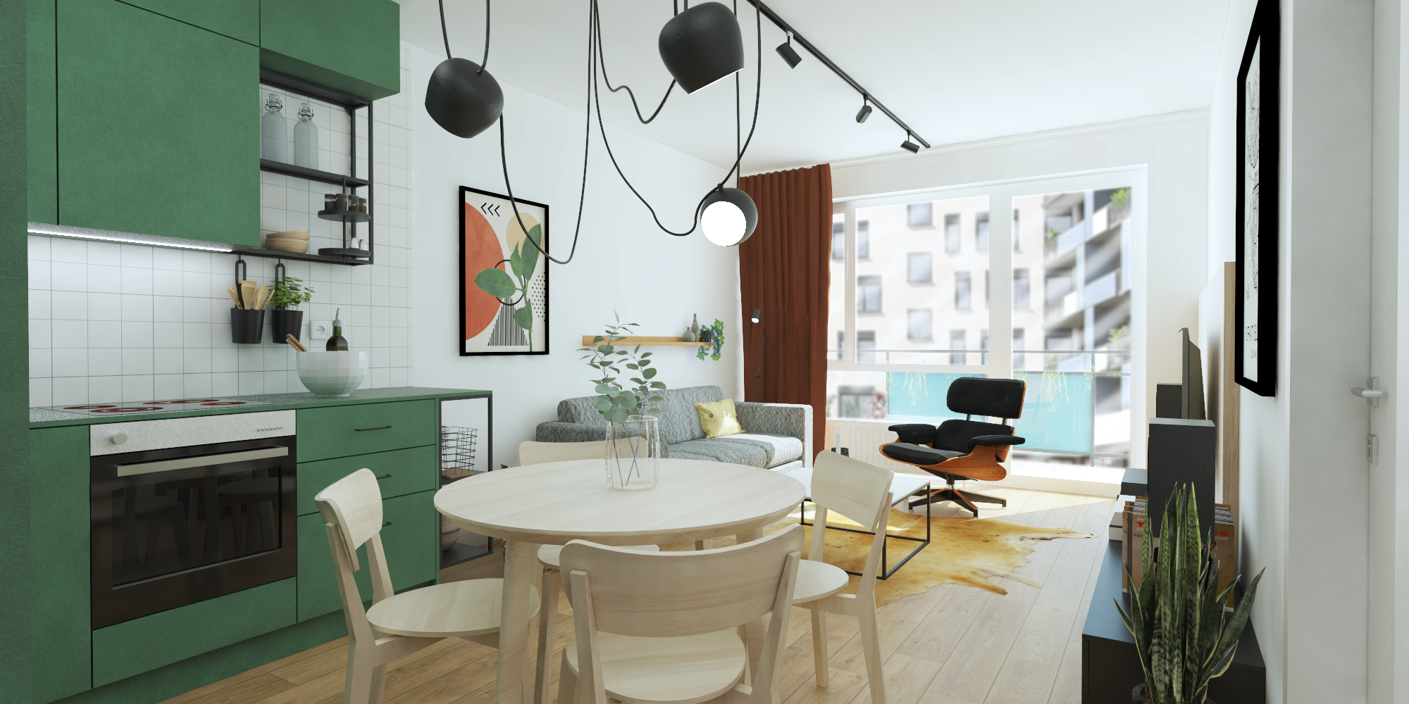 Denna nybyggda tvåa har en modern och stilig känsla med kontrastrika detaljer och färger. Den är designad för en ung man som tycker om inredningsdesign och vill ha plats att laga god mat, lyssna på sina LP-skivor och att enkelt ta med sin cykel på långa turer på helgerna.
