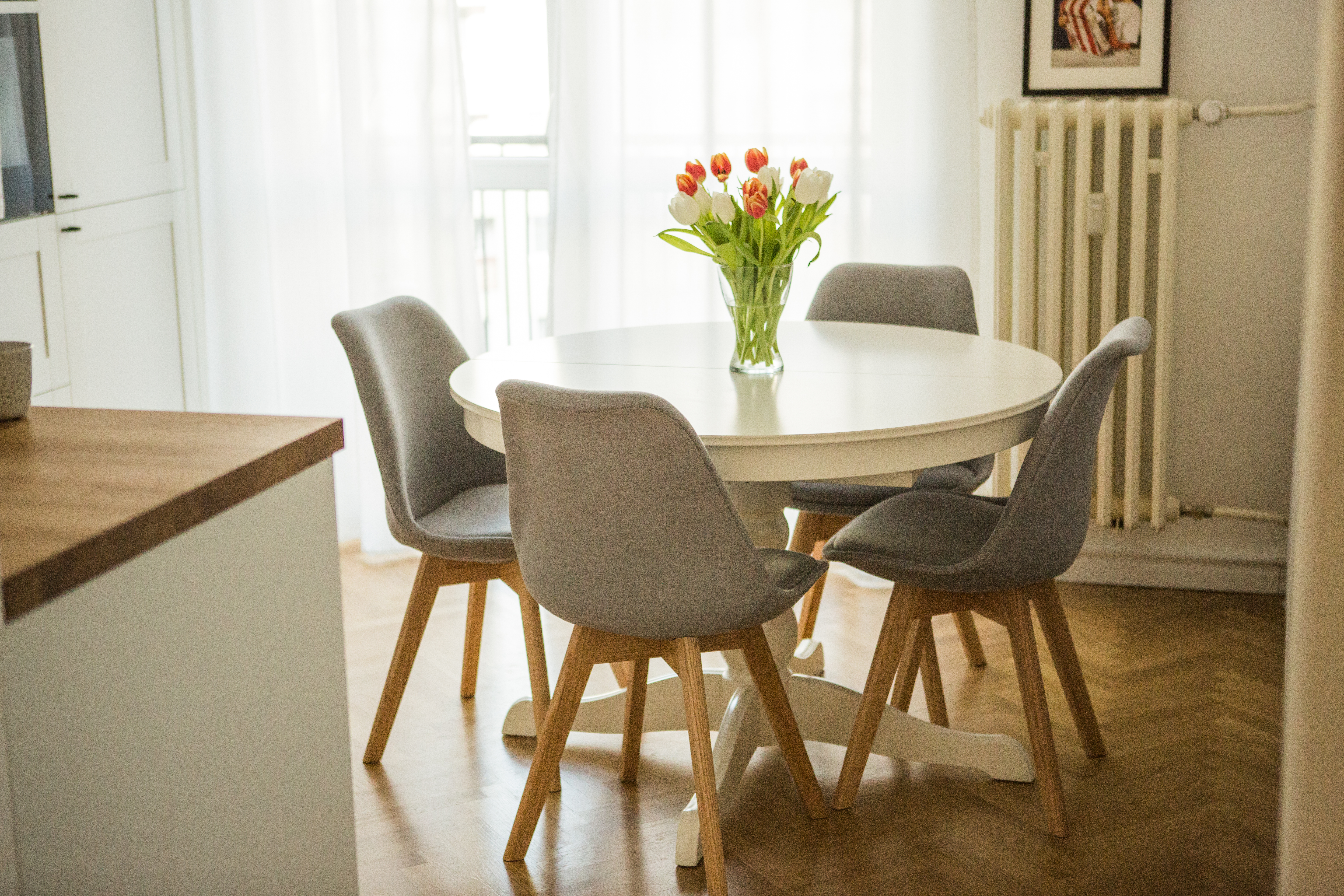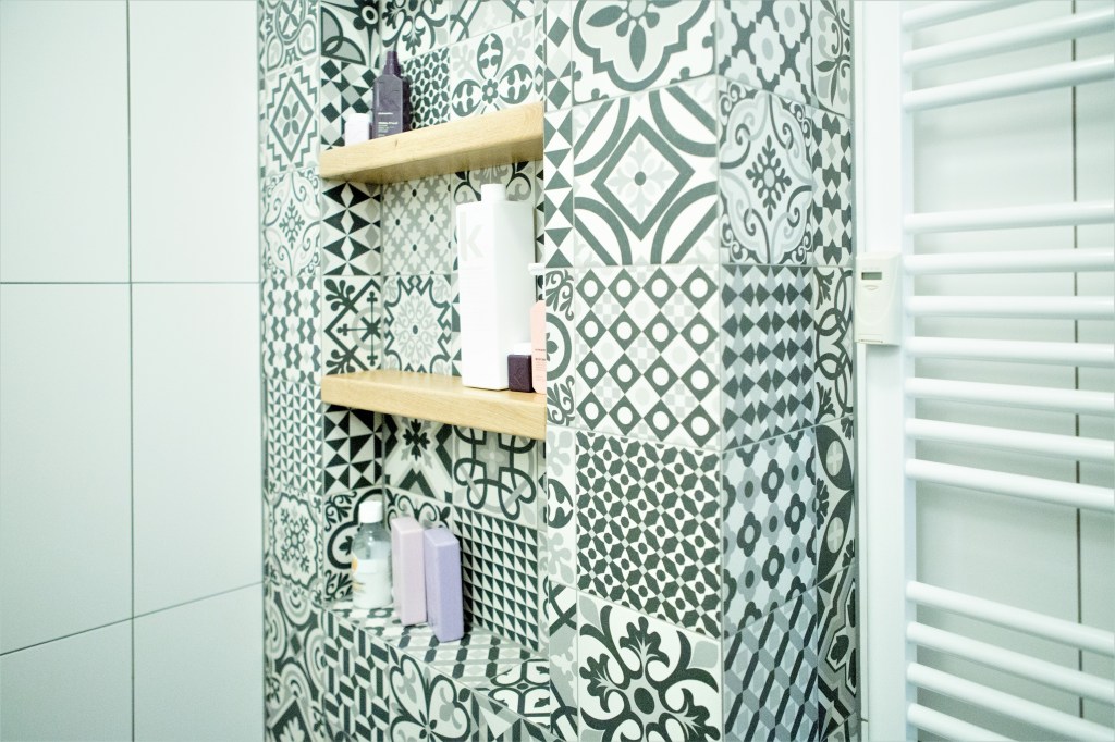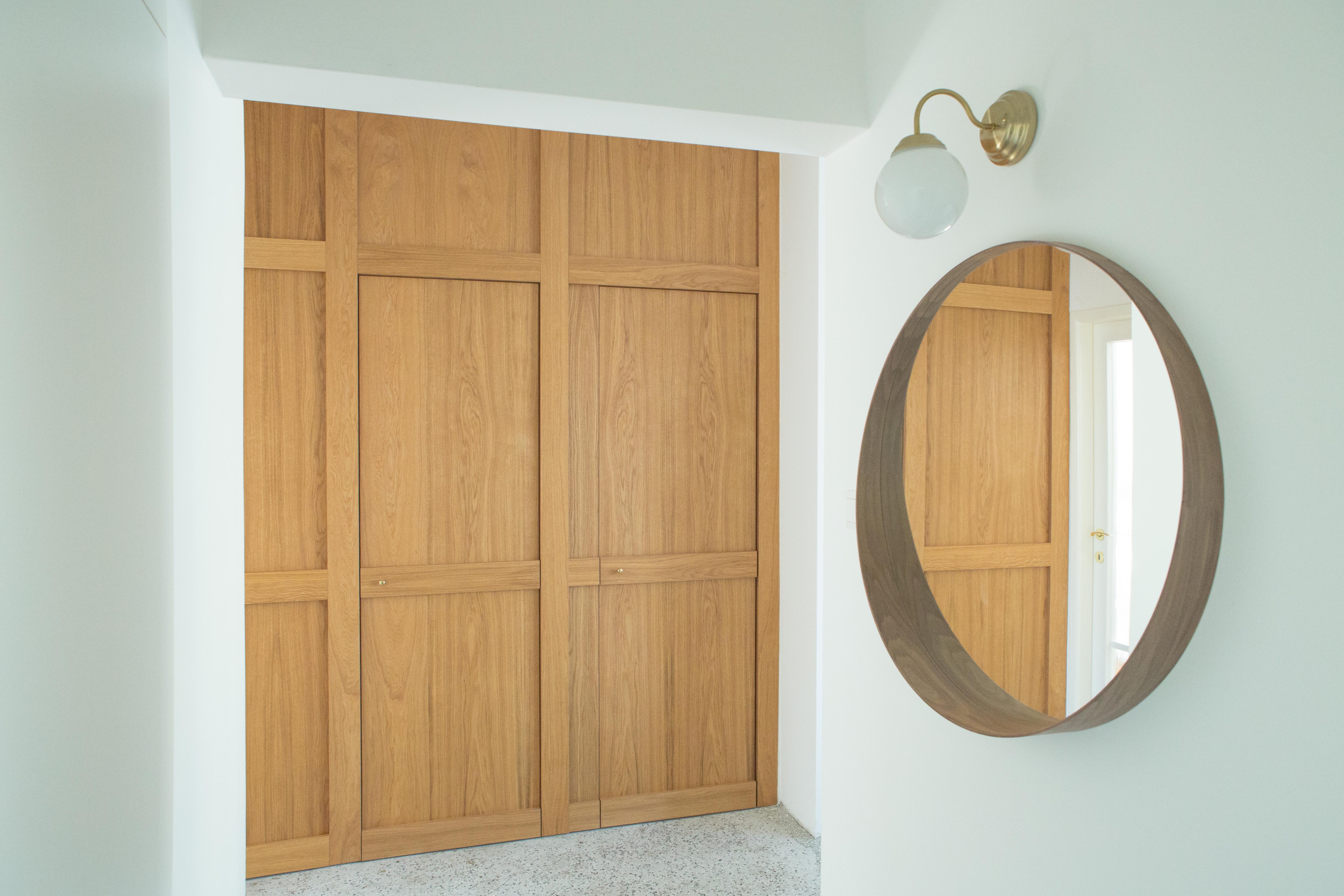 En intressant detalj är att badrummet finns gömt bakom hemliga dörrar i en panelvägg av träfanér. I lägenheten finns platsbyggda möbler som vi har formgivit, så som garderoben i hallen och bokhyllan i vardagsrummet. För att behålla lägenhetens mysiga atmosfär, valde vi att ha kvar och fräscha upp det gammla träparkettgolvet i båda rummen och även hallens vackra terrazzogolv.