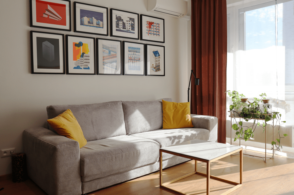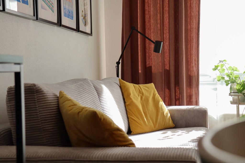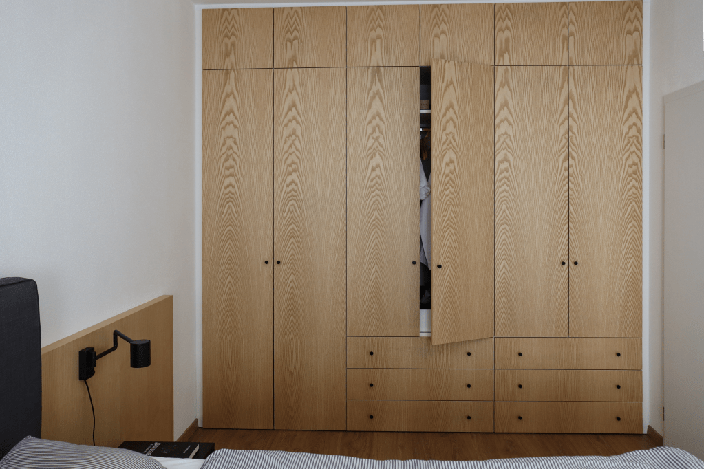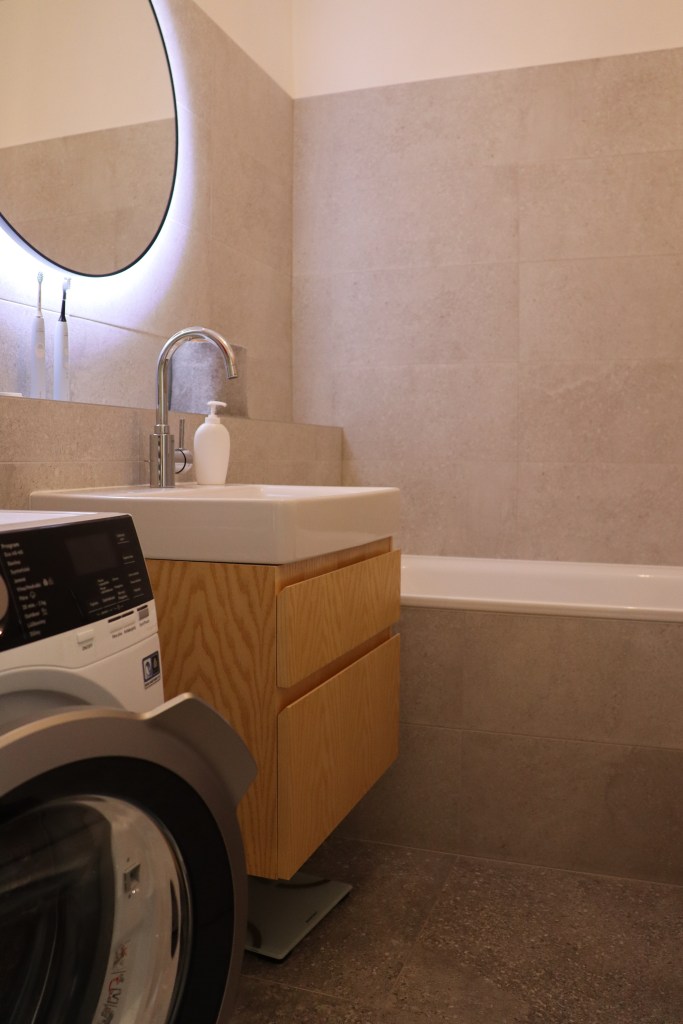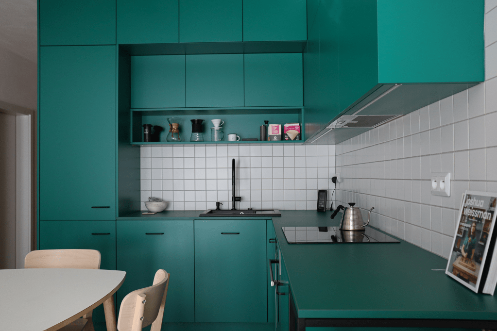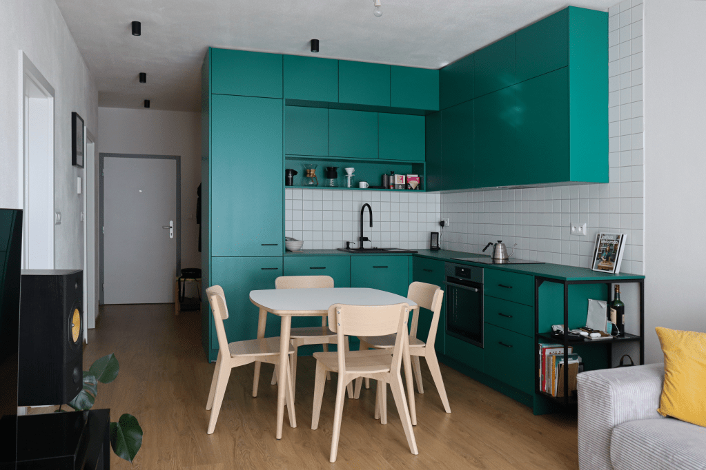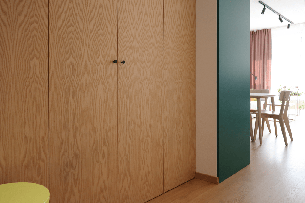 Lägenheten har ett snyggt, praktiskt kök med gröna enfärgade MDF-skivor. I vardagsrummet finns en bekväm soffa som är centrerad mitt emot hi-fi ljudsystemet. Lägenhetens sovrum har platsbyggda garderober i faner och nattduksbord på båda sidor av sängen. I hallen, bakom diskreta dörrar gjorda av faner, har vi skapat plats för ett smidigt cykelförråd där cykeläventyret lätt kan påbörjas.