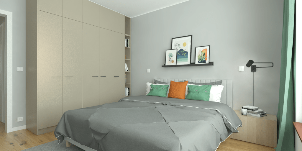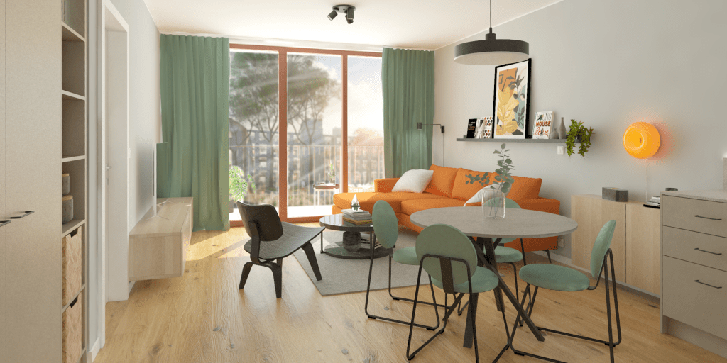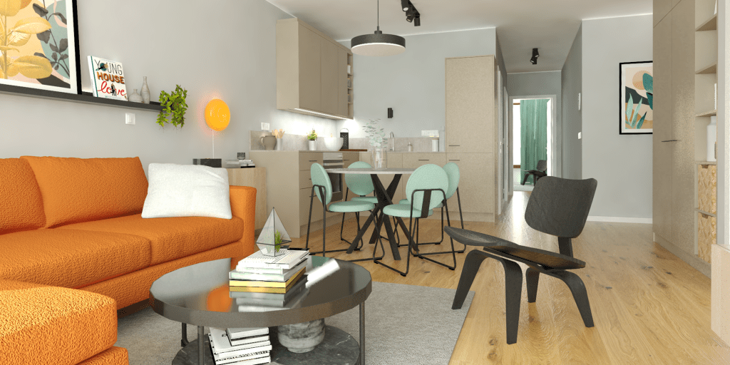 I ett nybyggnationsprojekt har vi designat en modern lägenhet med lyxig känsla. Vardagsrum och kök är i öppen planlösning och i hemmet finns två sovrum och ett badrum, allt i modern och ren stil.