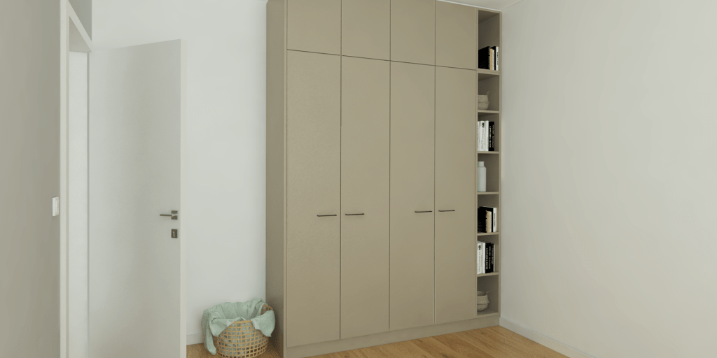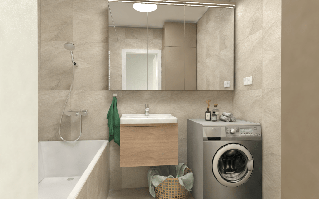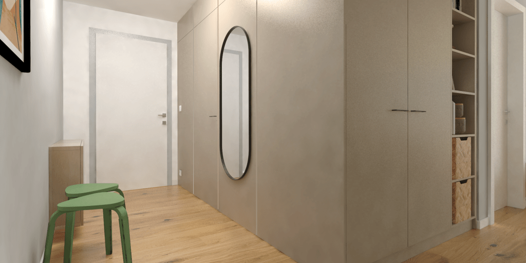 Ekparketten matchar den ljusbeige inredningen så som det platsbyggda köket, panelen i hallen, garderoben i sovrummet och badrumsskåpen. Matplatsen har ett runt bord med stolar i annorlunda design och kontrastrika färger. I det stora skåpet i köket finns ett rymligt skafferi. Den lilla hallen får en utvidgad känsla genom en panelvägg som också gömmer dörrar till ett förråd. Platsbyggda garderober i de båda sovrummen har bra förvaringsmöjligheter med lådor bakom dörrarna samt öppna hyllplan för böcker och fina inredningsprylar. Lägenhetens badrum är helkaklat med keramiska plattor i 60×60-format. De stora spegelskåpen gör badrummet ljusare och optiskt större. Här finns även smart förvaring.