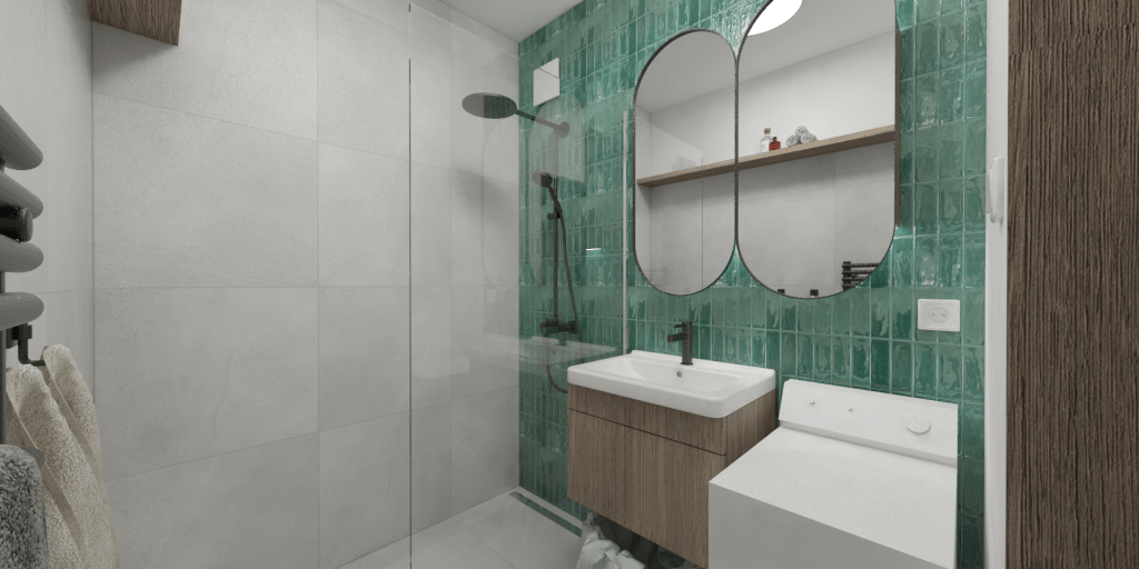 Badrummet och toan fick ny kakel och klinker, runda speglar och moderna svarta detaljer som vattenkran och duschblandare.