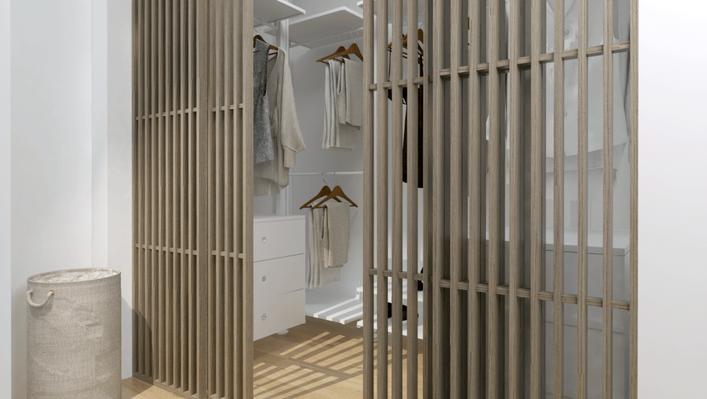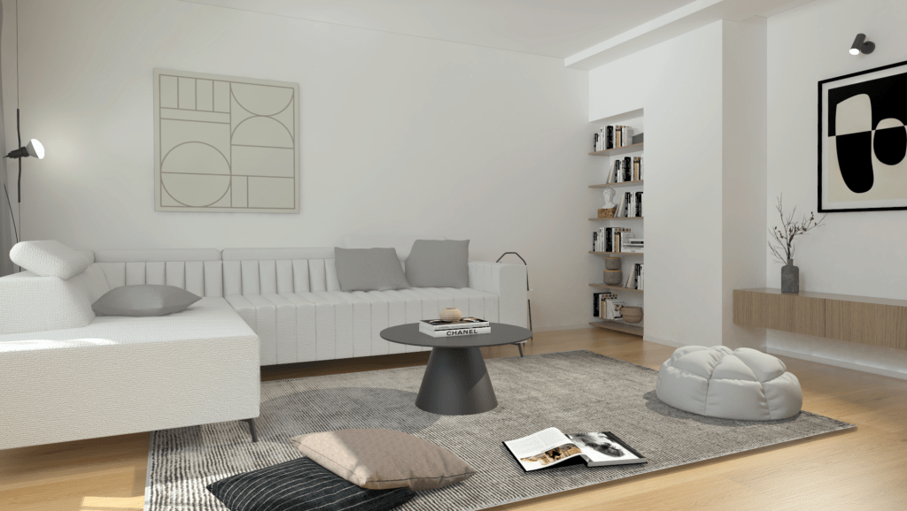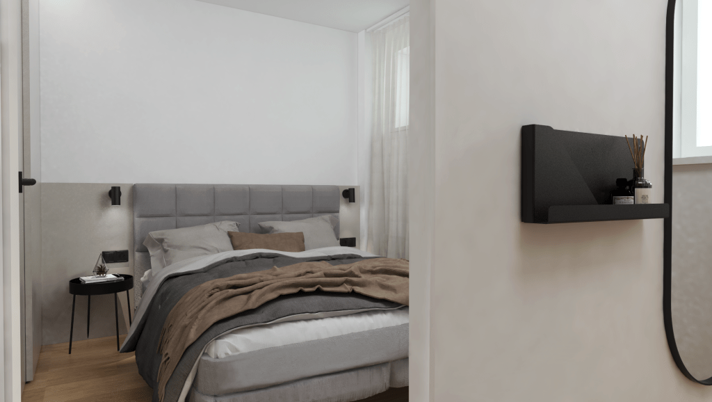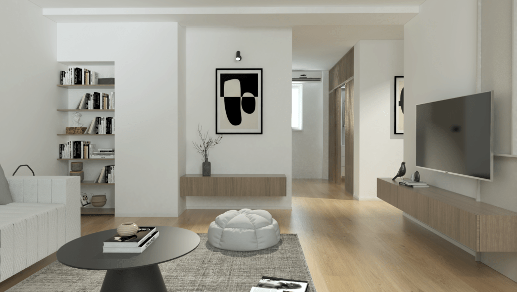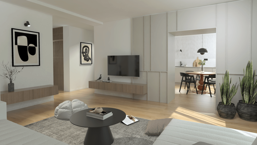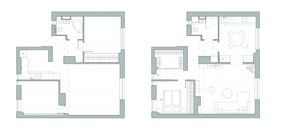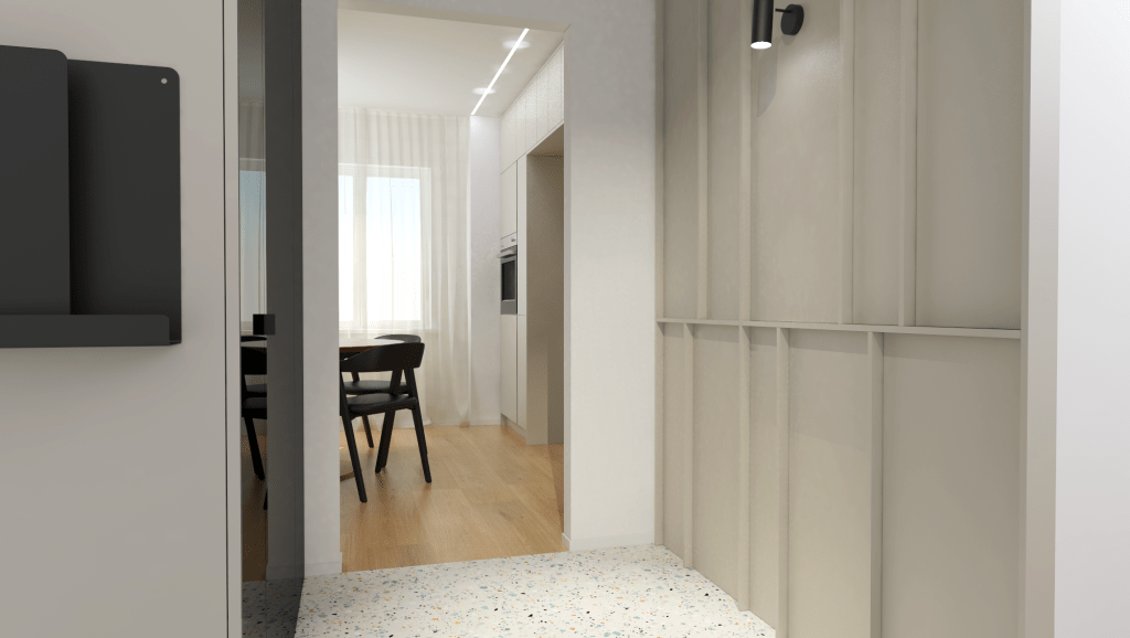 Det var inte nödvändigt att bevara 3-rumslayouten, utan snarare att öka nivån på boende och utöka kvalité av spenderade tid i lägenheten. Dämpade färger och material med ett mindre uttrycksfullt mönster var också tänkta att stödja lägenhetens vilsamma och avkopplande karaktär.