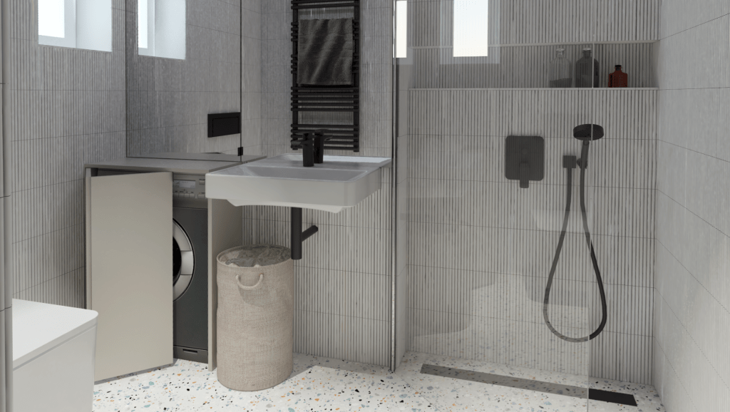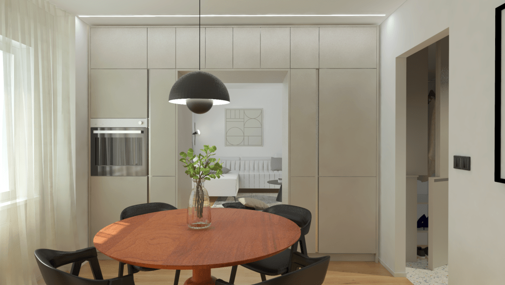 Lägenheten skapade alltså ett nytt kök med ett matbord kopplat till vardagsrummet på sidan mot gatan. Det befintliga köket ersattes av en klädkammare kopplad till ett mysigt sovrum genom en ny dörröppning. I badrummet byttes hörnbadkaret ut mot ett praktiskt duschkabin.