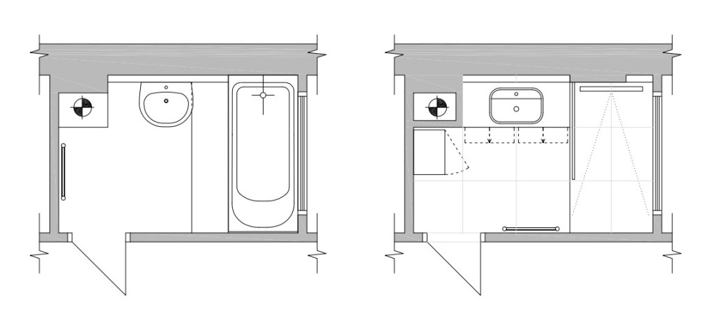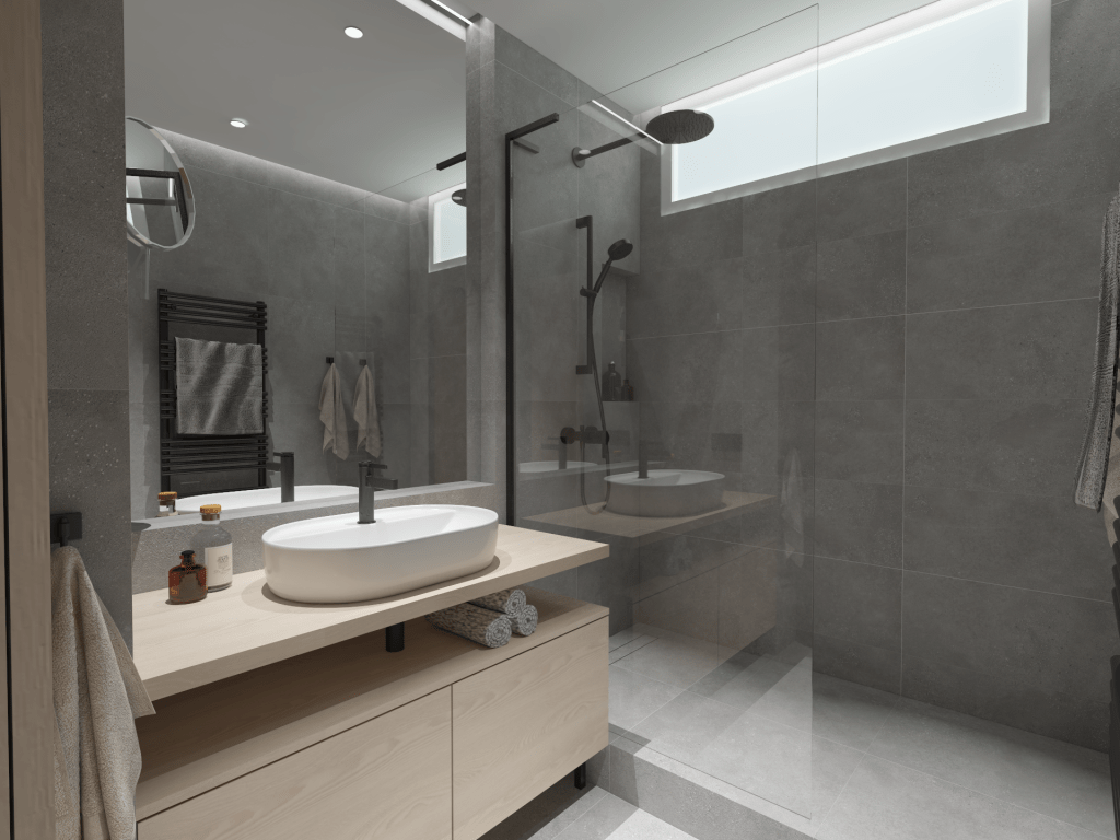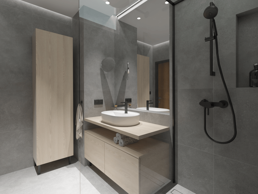 Med kakel i storformat (60×60 cm) och i betongdekor, och med specialdesignade möbler i ask och svarta detaljer, får det här badrummet en rogivande atmosfär. Det ursprungliga badkaret ersattes av en stor dusch med glasvägg.