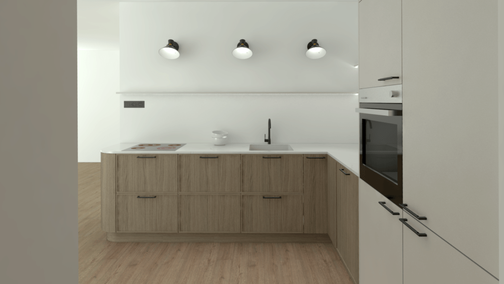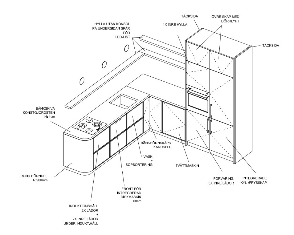Köksrenovering i moderna jordnära toner och naturliga material. Köket har en minimalistisk karaktär med rena linjer, öppna hyllor och rundade hörn. Tack vare den smarta lösningen finns det, trots de mindre måtten, tillräckligt med förvaringsutrymme för köksredskap, mat och gott om arbetsyta.