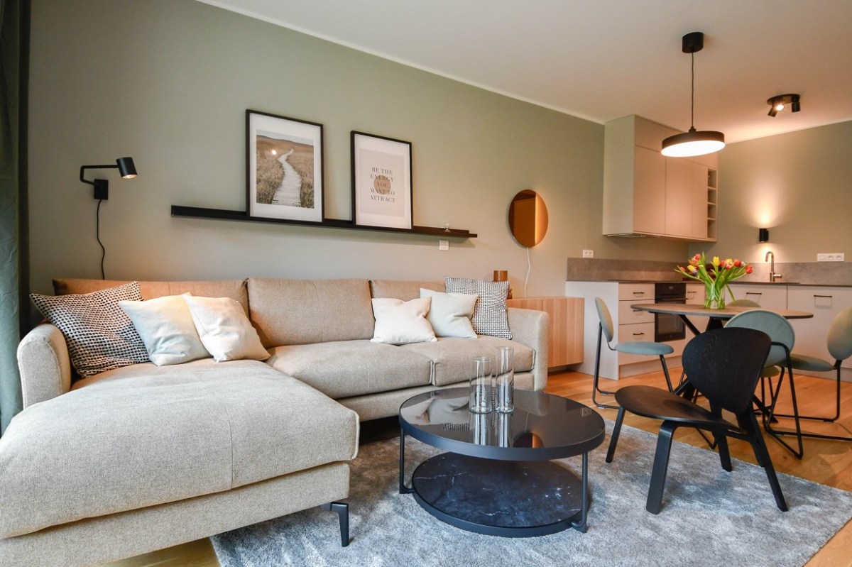 Köksrenovering i moderna jordnära toner och naturliga material. Köket har en minimalistisk karaktär med rena linjer, öppna hyllor och rundade hörn. Tack vare den smarta lösningen finns det, trots de mindre måtten, tillräckligt med förvaringsutrymme för köksredskap, mat och gott om arbetsyta.
