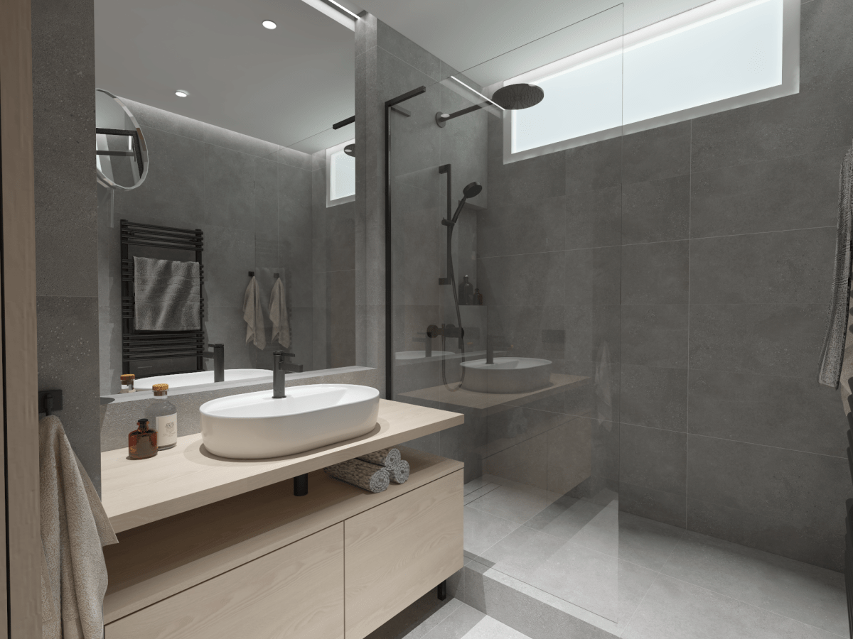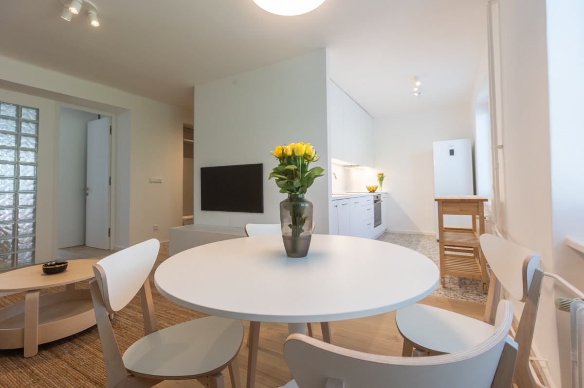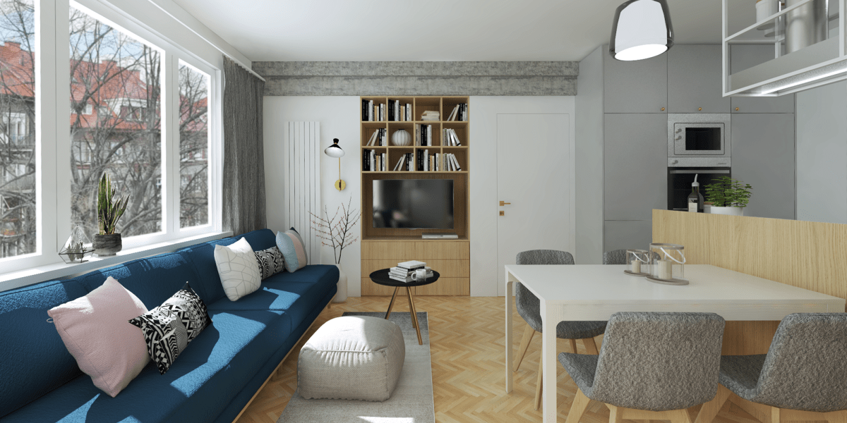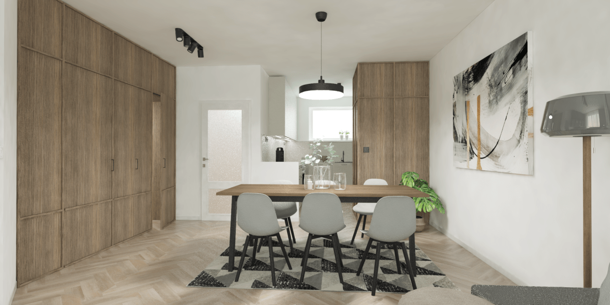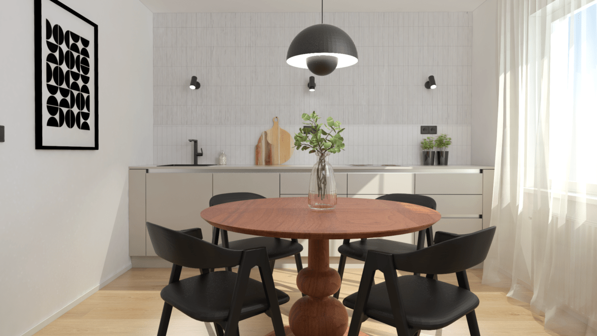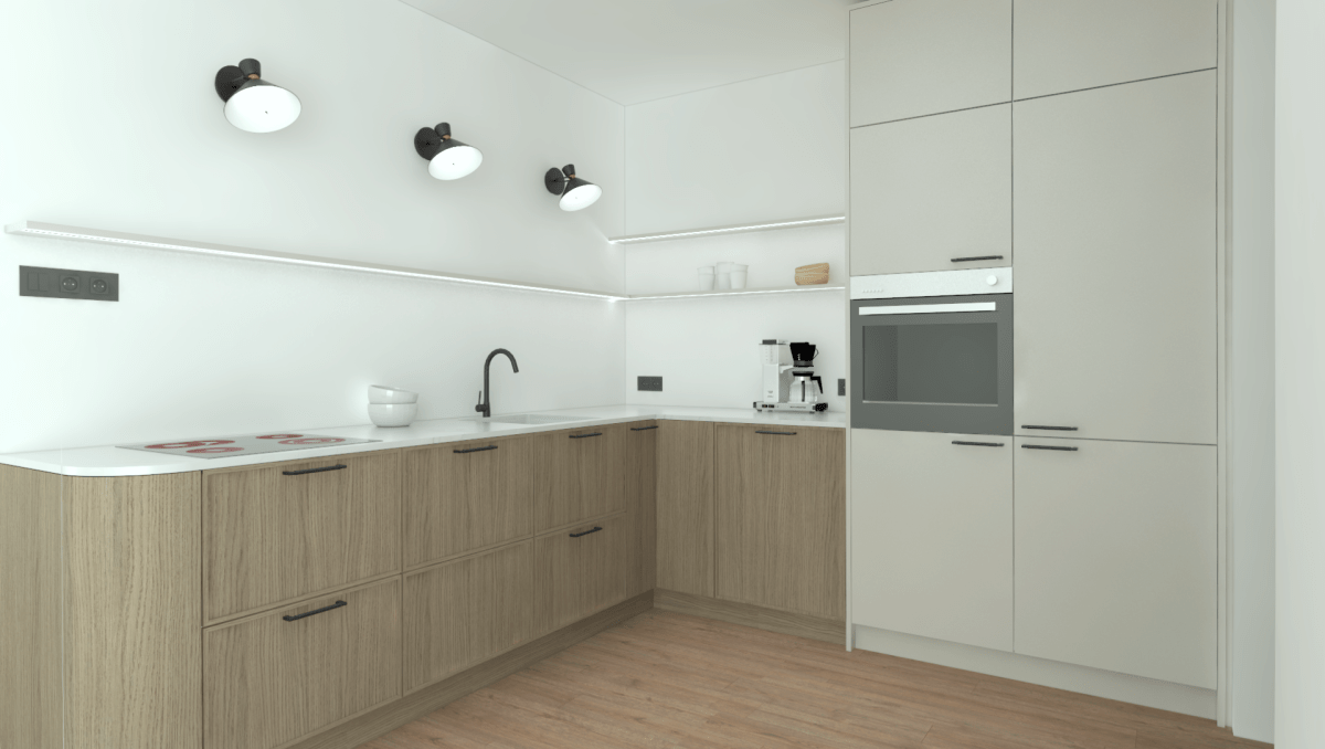 Köksrenovering i moderna jordnära toner och naturliga material. Köket har en minimalistisk karaktär med rena linjer, öppna hyllor och rundade hörn. Tack vare den smarta lösningen finns det, trots de mindre måtten, tillräckligt med förvaringsutrymme för köksredskap, mat och gott om arbetsyta.